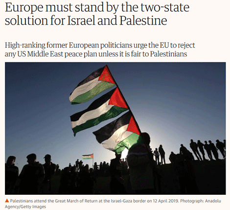 In ihrem »Leserbrief«, den die Tageszeitung The Guardian auf ihrer Website ganz passend unter einer Aufnahme von den gewalttätigen »palästinensischen« Krawallen an der Grenze Gazas zu Israel veröffentlichte, setzen die Unterzeichner, unter ihnen auch der ehemalige deutsche Außenminister Sigmar Gabriel, sich für einen Staat »Palästina« ein, den sie durch Donald J. Trump gefährdet sehen.